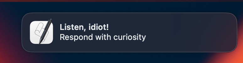 13 */2 * * * osascript -e 'display notification "Respond with curiosity" with title "Listen, idiot!"'